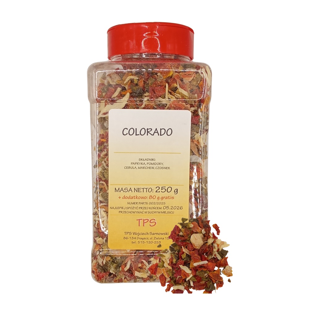 Przyprawa Colorado charakteryzuje się wyrazistym, lekko pikantnym smakiem, pięknym, czerwono-złocistym kolorem oraz uniwersalnością, dzięki której świetnie sprawdza się w potrawach grillowych i domowych. Produkt nie zawiera sztucznych aromatów ani konserwantów — to naturalna, zbalansowana mieszanka ziół i przypraw.
